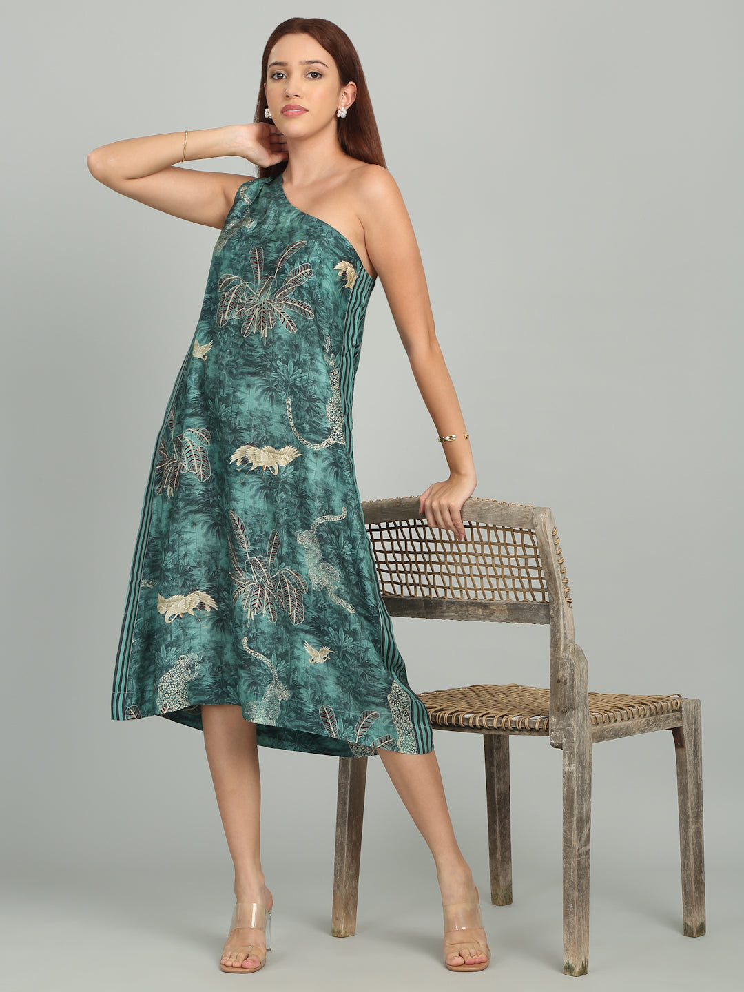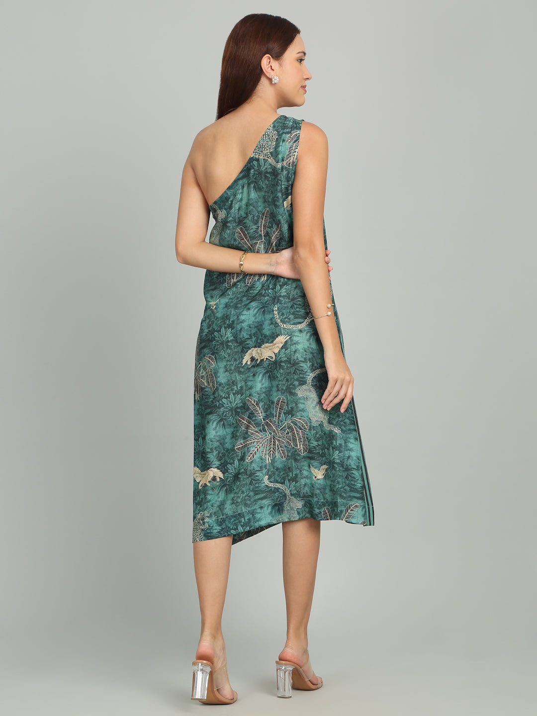 A -Line Dress with one shoulder design and conceealed zip on the left.