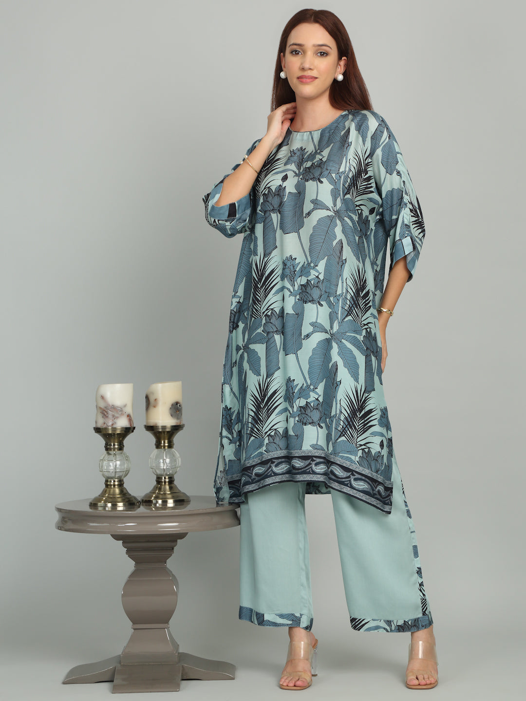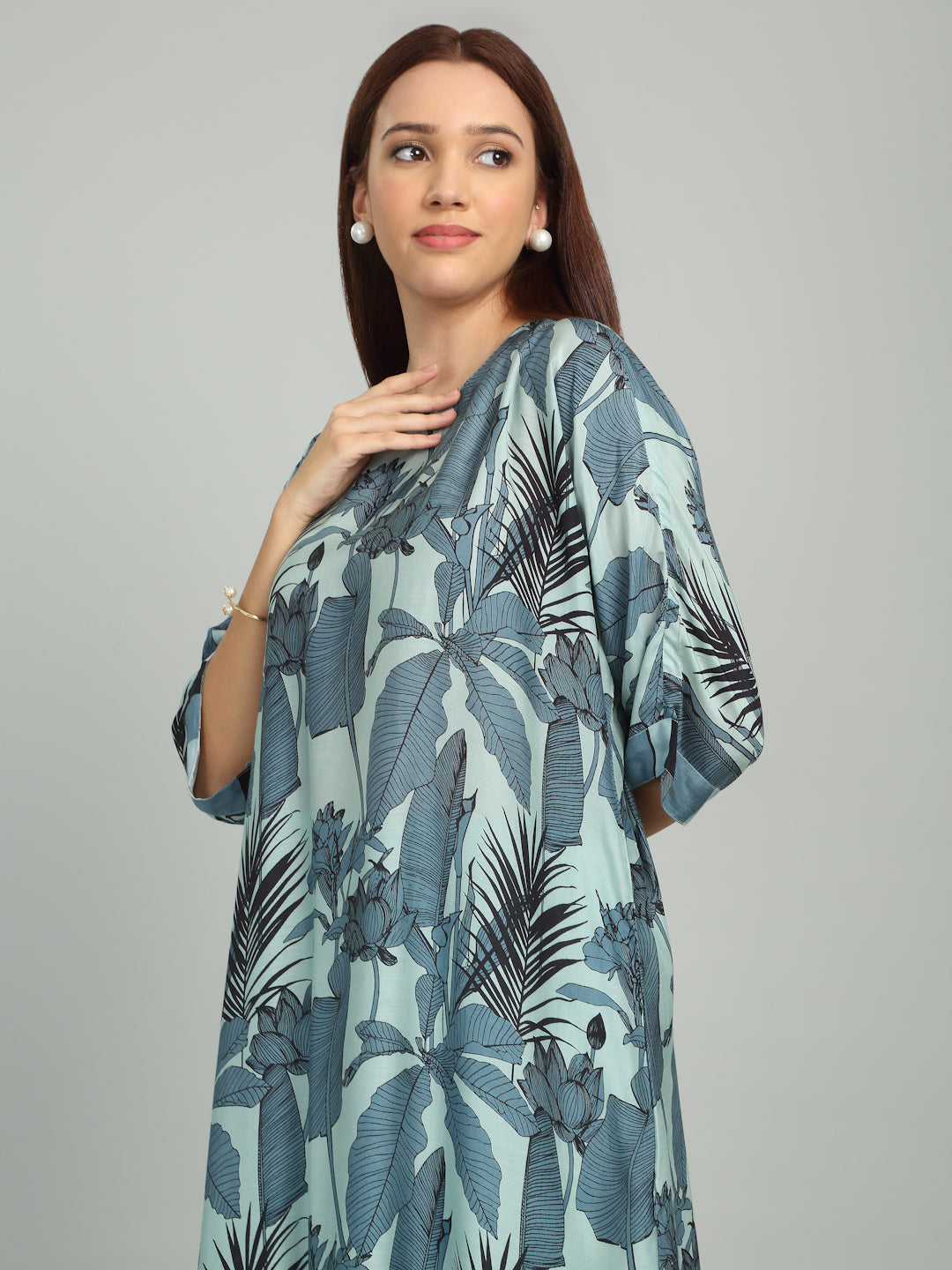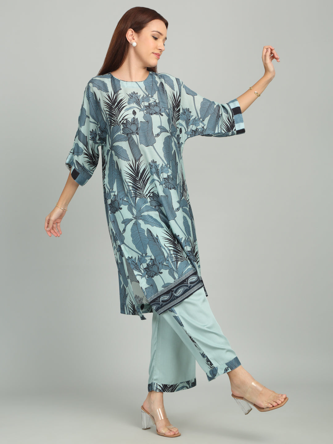 Embrace tropical vibes with this kurta set, featuring a bold leafy print that adds a touch of natural elegance and freshness