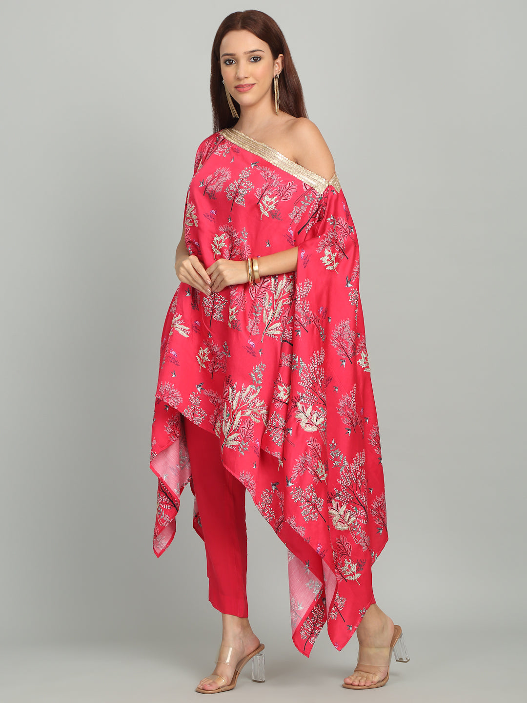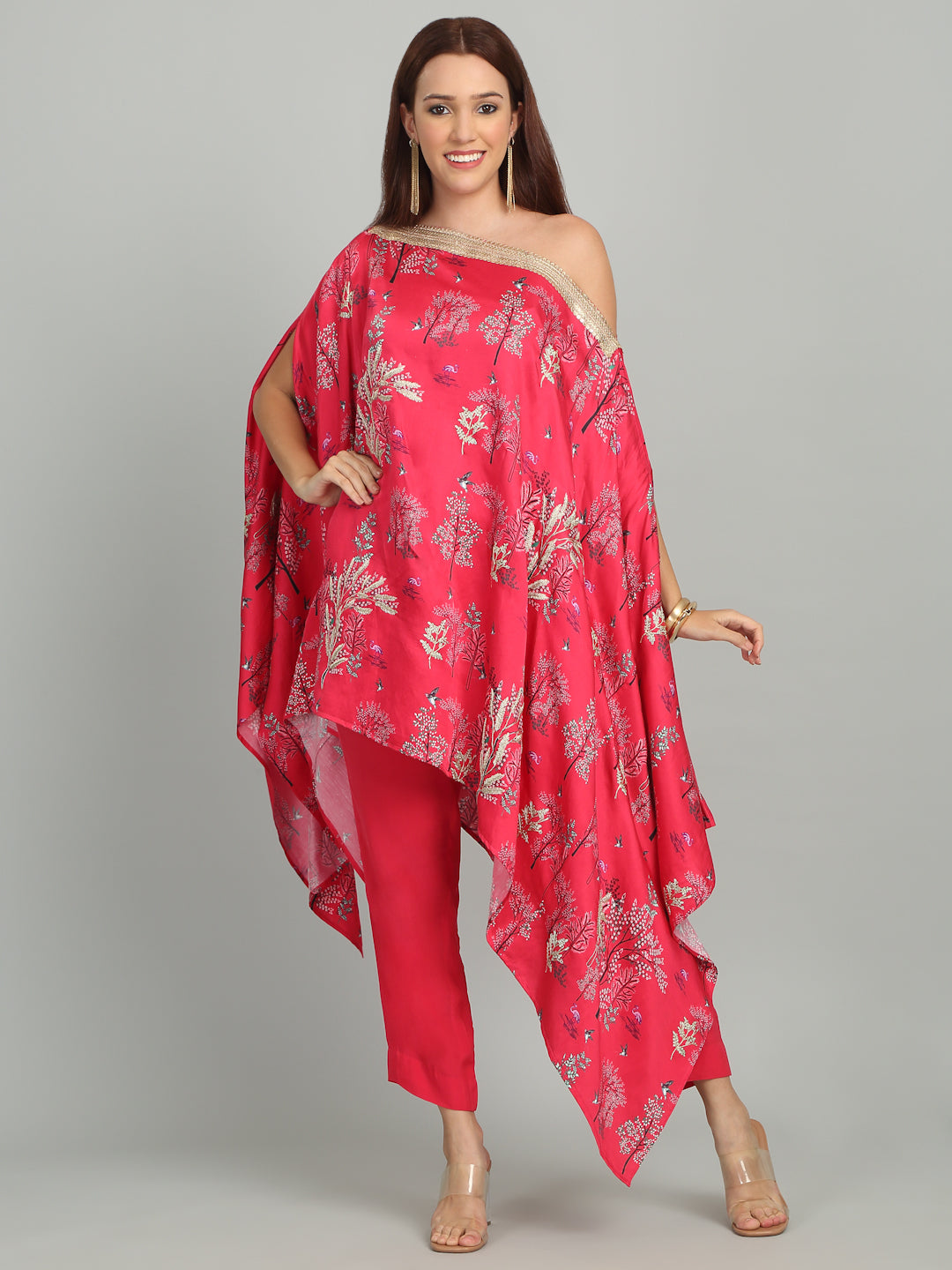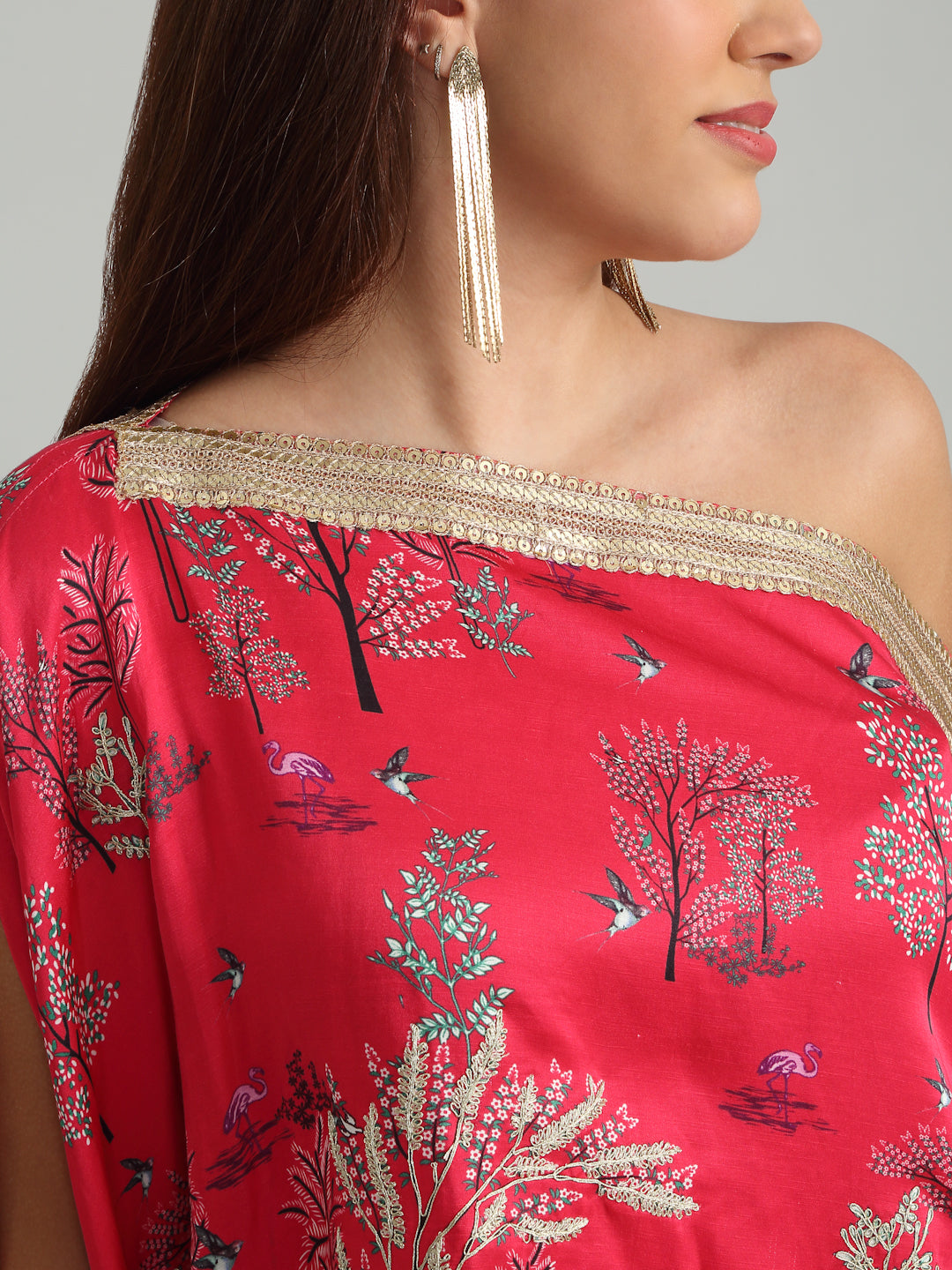 A vibrant off-shoulder embroidered tunic with lace in striking print, evoking the sparkling elegance of Mumbai’s iconic Queens Necklace
