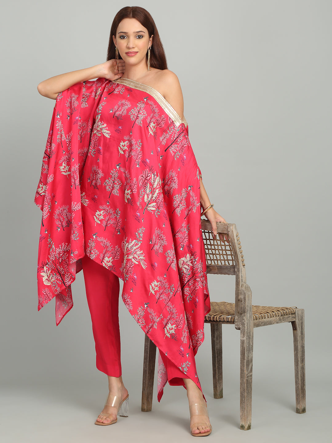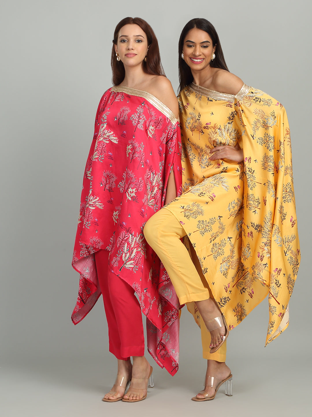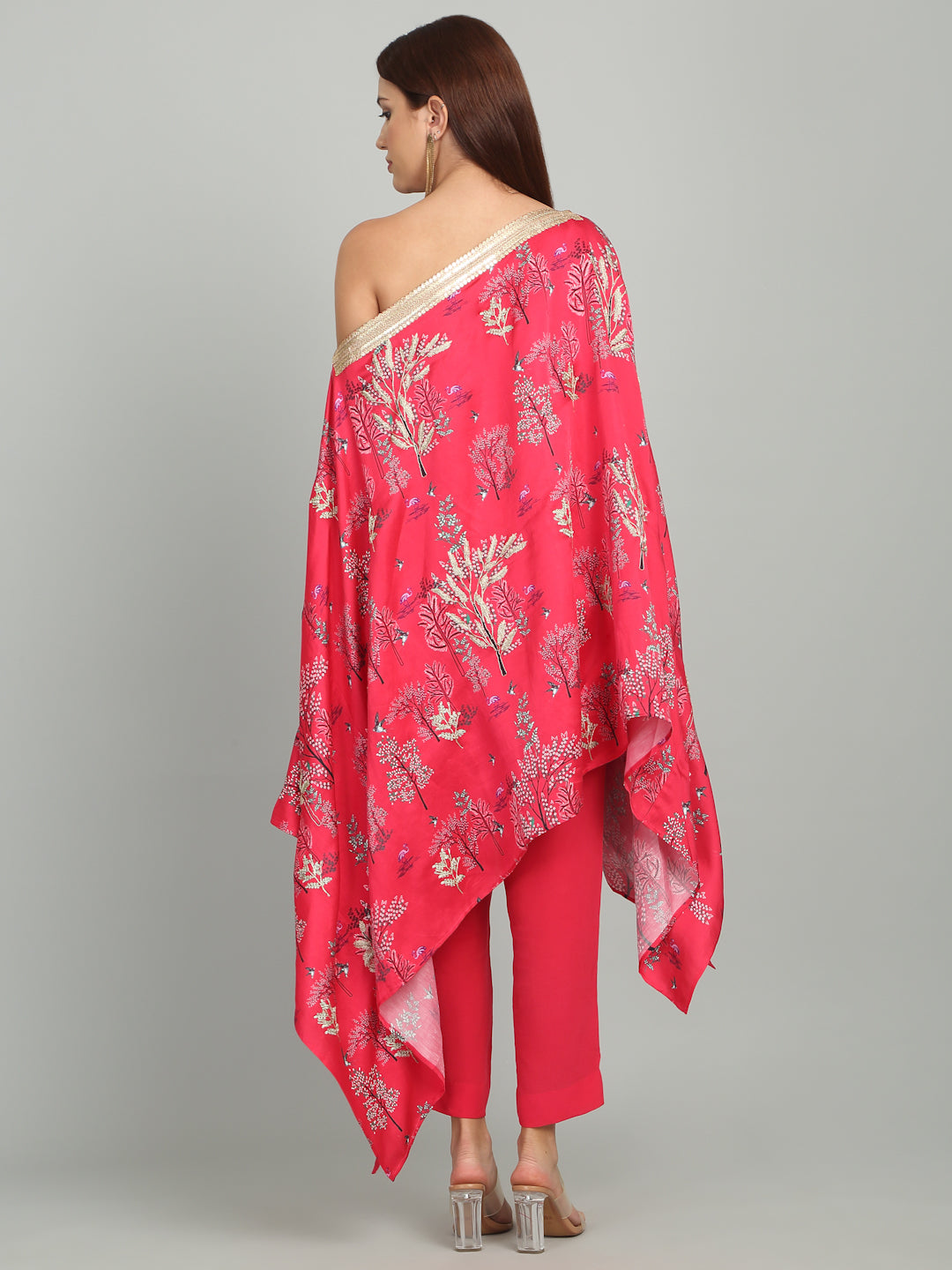 A vibrant off-shoulder embroidered tunic with lace in striking print, evoking the sparkling elegance of Mumbai’s iconic Queens Necklace