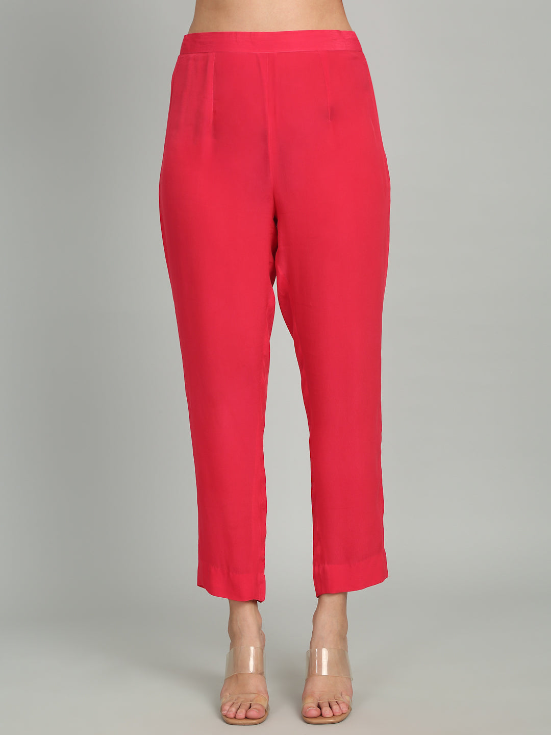 Pants with an elasticated back, side pockets, and a concealed zip on the left.