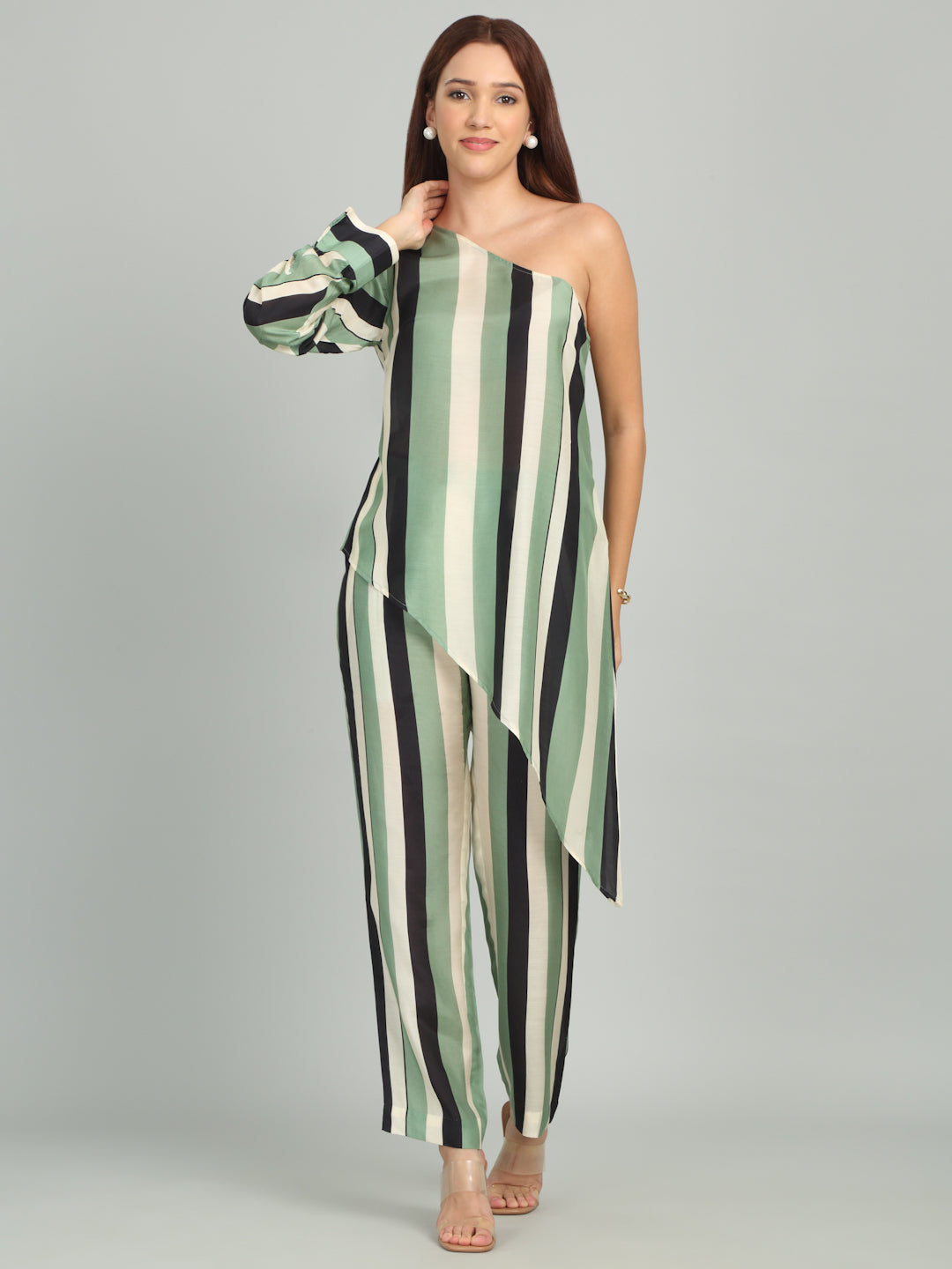 A chic asymmetric off-shoulder stripe top paired with matching pants, creating a modern, stylish look with bold, contemporary lines.