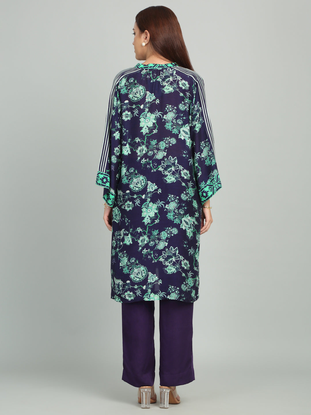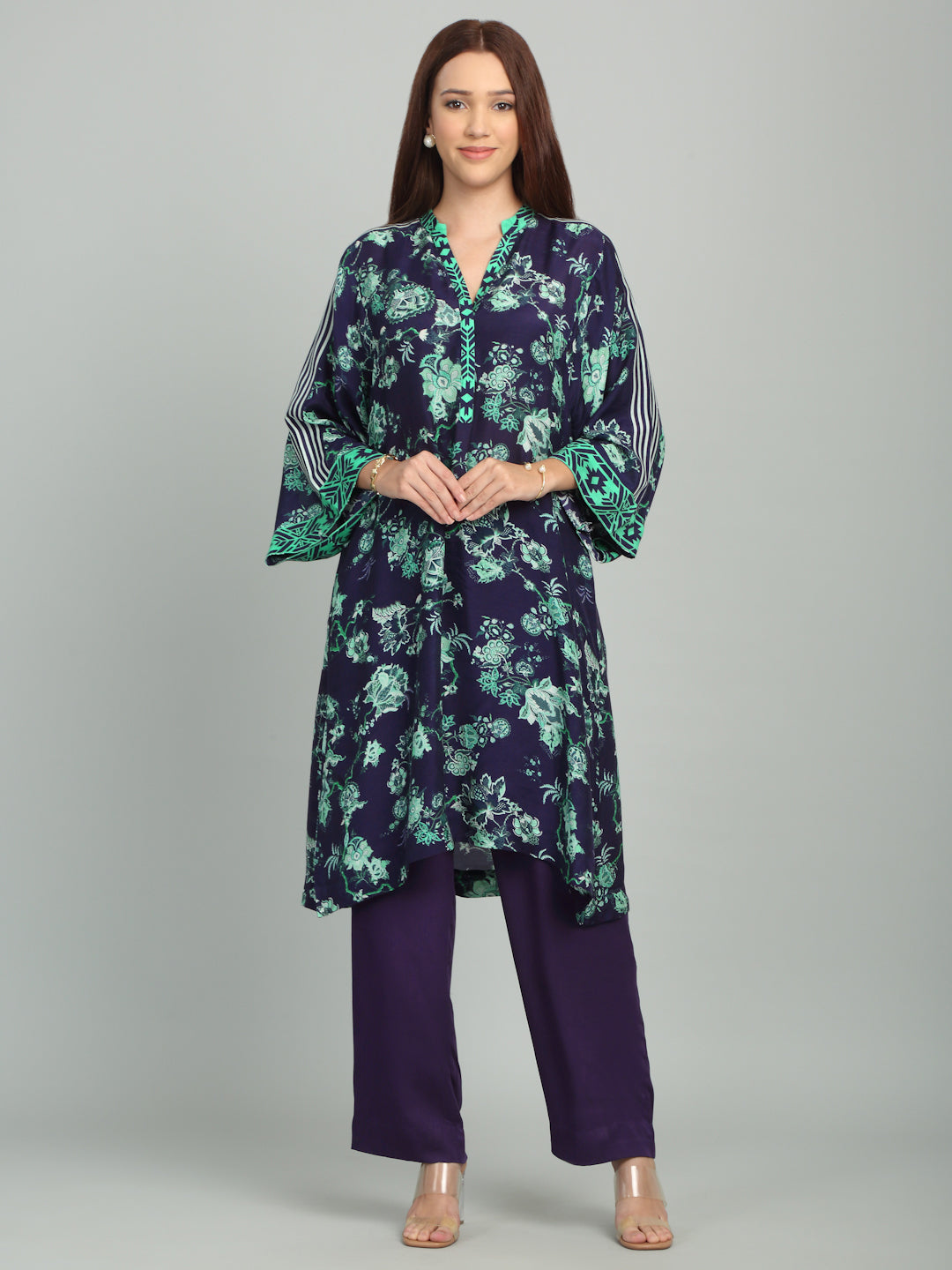 A loose-fit kurta with a partial front opening, featuring bell and L-shaped sleeves