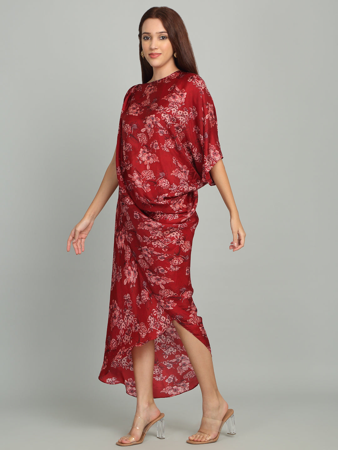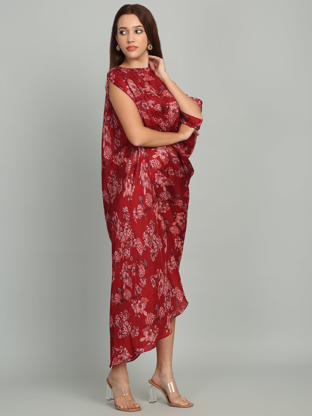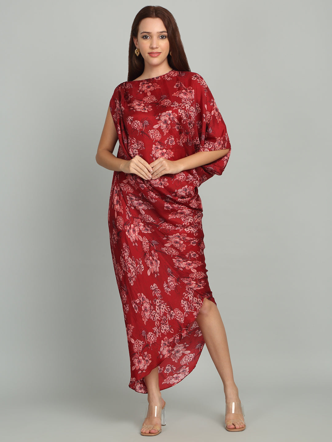 A long dress with a sleeveless right side and a bat sleeve on the left for an asymmetrical look